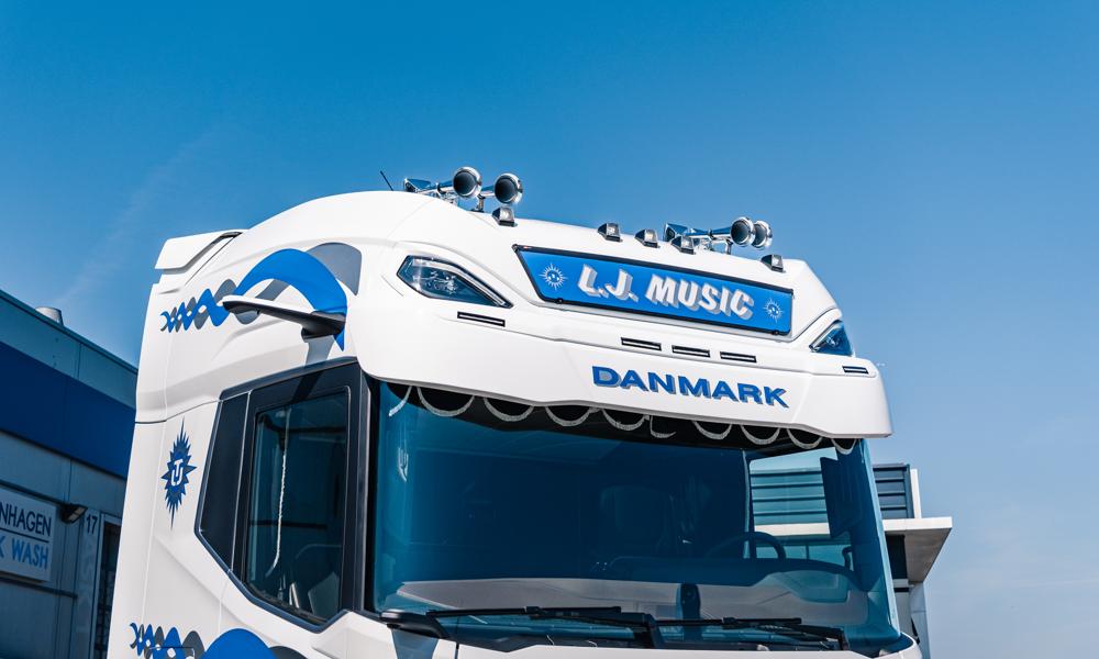 DAF’en er blevet lakeret i sort/hvid og monteret med L.J. Transports blå detaljer.