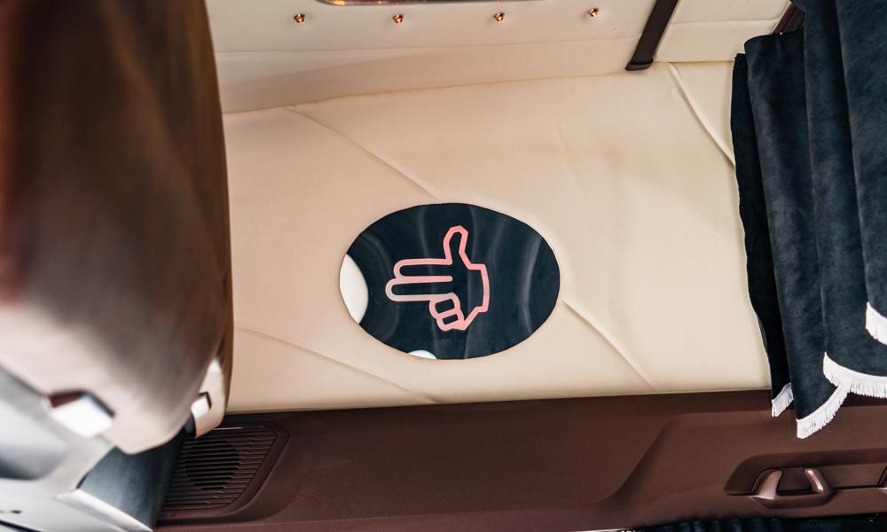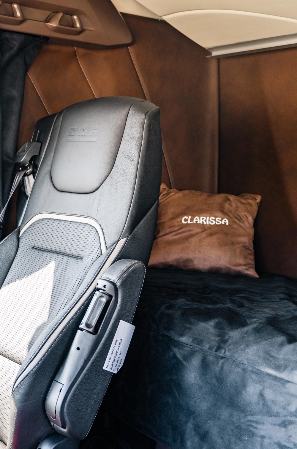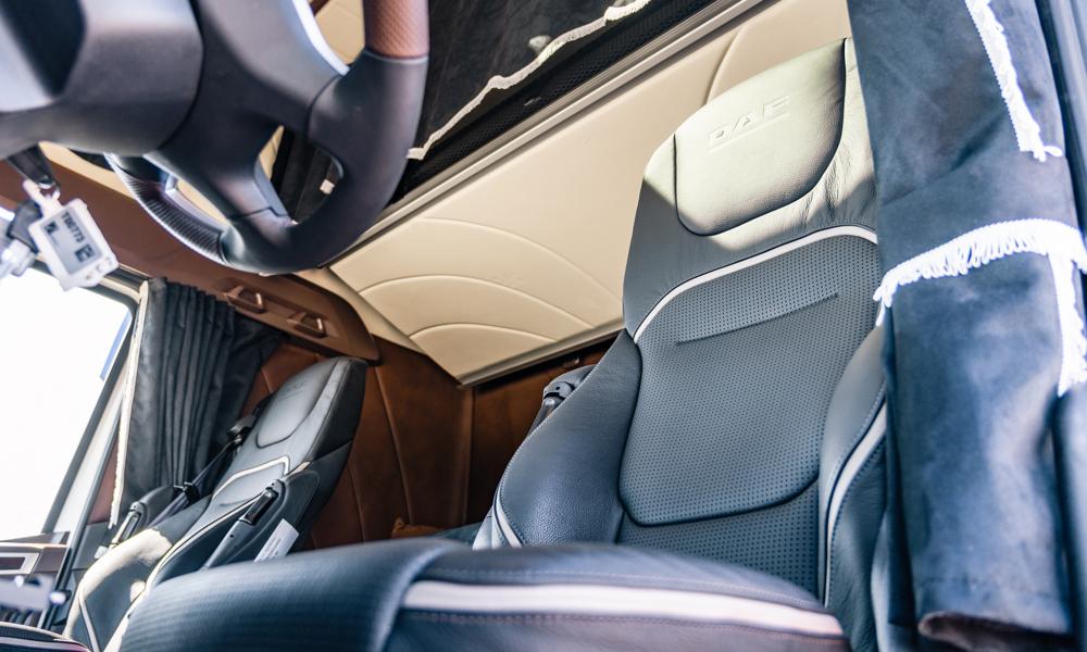 Kabinen har gennemgået en stor makeover hos In-truck, hvor den er plysset med mørkt brunt og hvidt læder, og plastikdele er blevet lakeret i samme brune farve. Der er også blevet monteret spejlglas i hver side. Derudover er der blevet fremstillet nye gardiner, puder og sengetæppe, der matcher designet.
