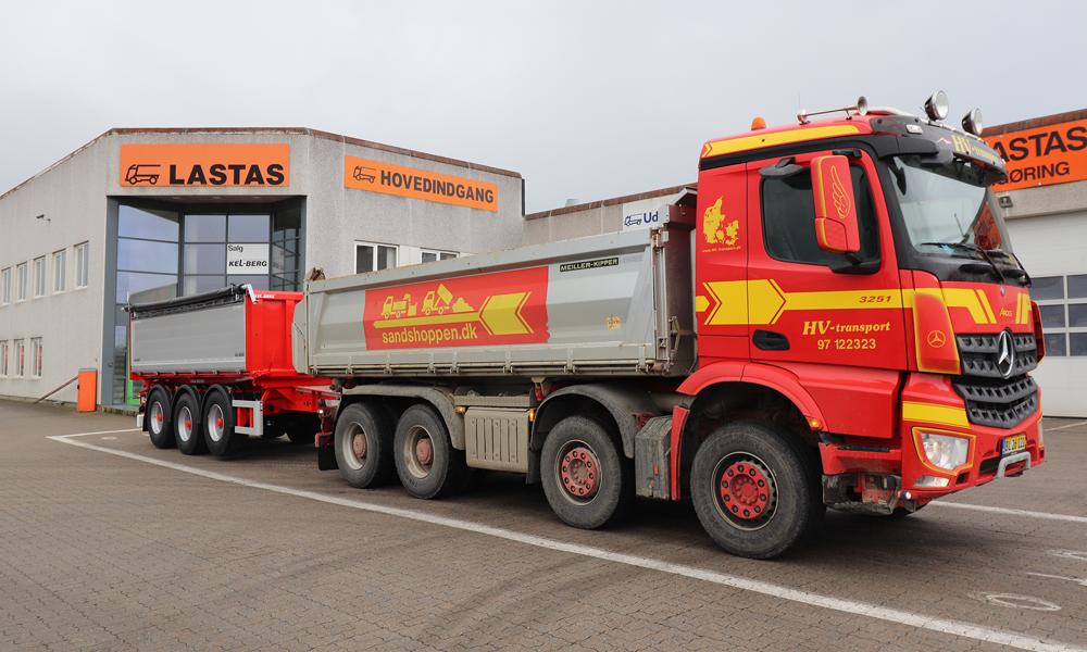 En Kel-Berg treakslet 24 tons tipkærre med trevejstip. Den er nu i vognparken hos HV-transport i Herning.