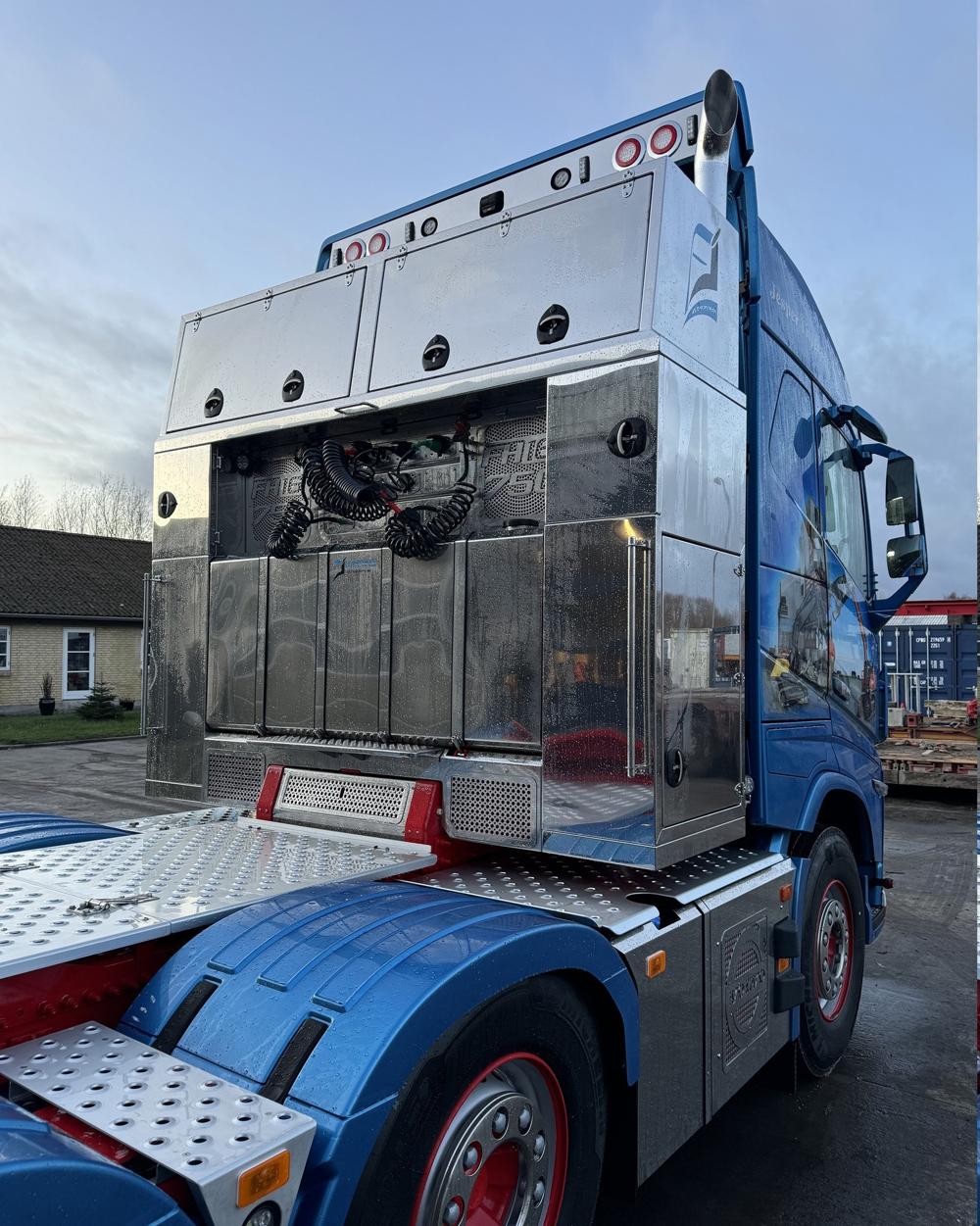 Sværgodstrækkeren er opbygget med rustfri skabe og alu-afdækning hos FJ Lastvagnar i Hasslarp. Lakering er udført hos AUMA i Frederikssund. Den sidste klargøring er udført af Volvos opbyggerteam i Taastrup.