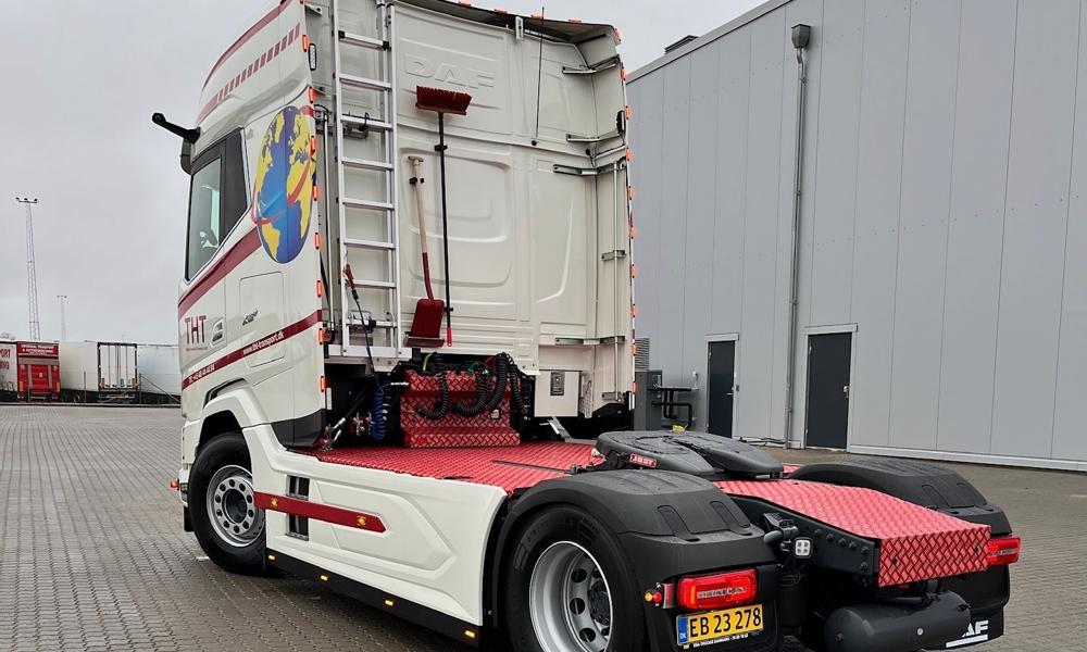 Trækkeren er udstyret med: Efficiency-pakke, klima-pakke, dobbelt aluminiumsstige, LED-forlygter med kurvelys, kamera-løsning samt CornerView, læderrat, Luxury-stole i begge sider, DAF Relax Bed (elevation), DAF Infotainment System Luxury med eksklusive højtalere, Urge to Move, fuldk dørplade lakeret med slebne toppe, hydraulik til tip/walking floor, skab under hytten, skab med skuffer integreret i sideskørt, luftpistol bag førerhuset og mikrobølgeovn.